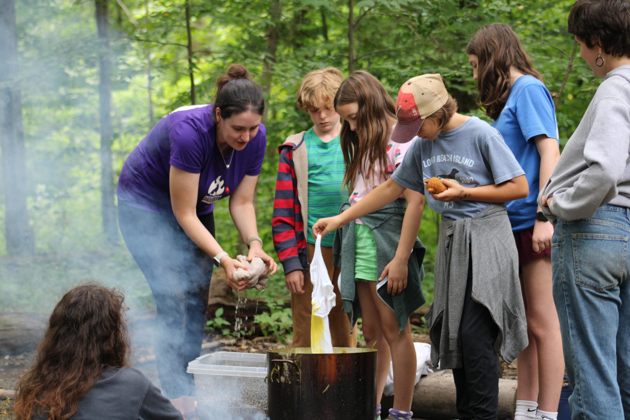 The forest is full of color! As Color Foragers we will harvest the brightest hues of the forest. This camp centers natural dyeing with wild plants and developing related skills. We will use our vibrantly dyed results to craft felted sculptures, hand sewn pouches, crocheted creations, and more. With an emphasis on communal work, connection to the land, and imbuing fiber with color, this camp is fertile ground for creativity. Join us as we spin tales and yarn around the fire. We welcome young artisans interested in learning skills as old as time and finding new avenues to appreciate the bounty of the forest.